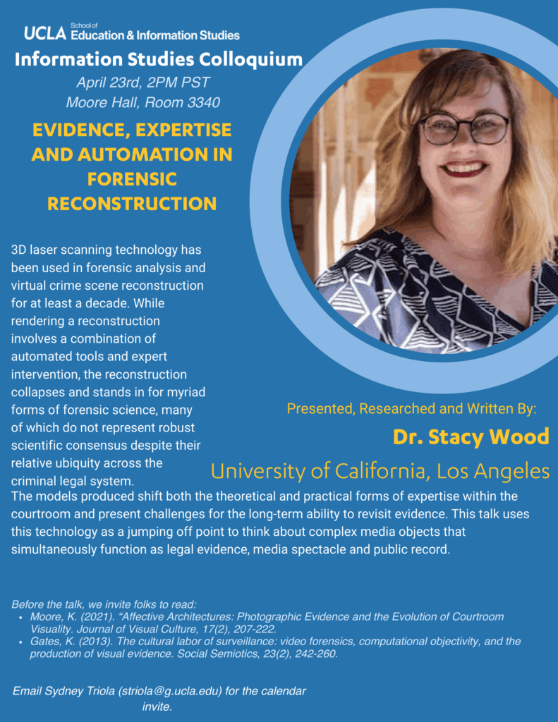 3D laser scanning technology has been used in forensic analysis and virtual crime scene reconstruction for at least a decade. While rendering a reconstruction involves a combination of automated tools and expert intervention, the reconstruction collapses and stands in for myriad forms of forensic science, many of which do not represent robust scientific consensus despite their relative ubiquity across the criminal legal system. The models produced shift both the theoretical and practical forms of expertise within the courtroom and present challenges for the long-term ability to revisit evidence. This talk uses this technology as a jumping off point to think about complex media objects that simultaneously function as legal evidence, media spectacle and public record.