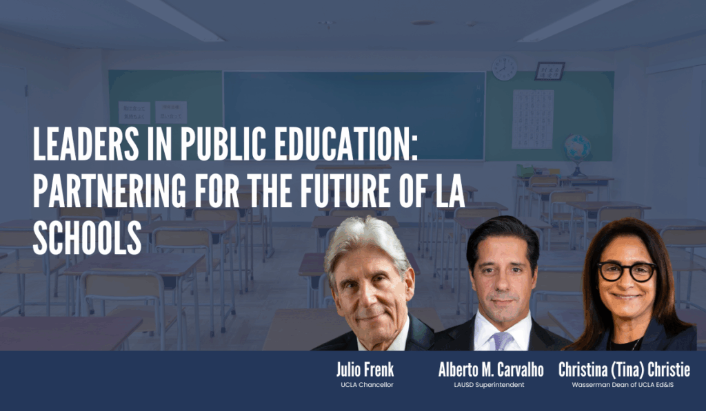 Join us for a thought-provoking discussion featuring UCLA Chancellor Julio Frenk and LAUSD Superintendent Alberto Carvalho, moderated by Wasserman Dean Christina (Tina) Christie.