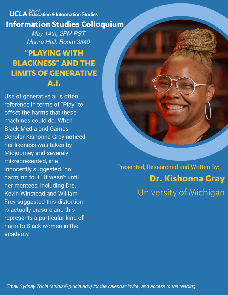 Use of generative A.I. is often reference in terms of “Play” to offset the harms that these machines could do. When Black Media and Games Scholar Kishonna Gray noticed her likeness was taken by Midjourney and severely misrepresented, she innocently suggested “no harm, no foul.” It wasn’t until her mentees, including Drs. Kevin Winstead and William Frey suggested this distortion is actually erasure and this represents a particular kind of harm to Black women in the academy.