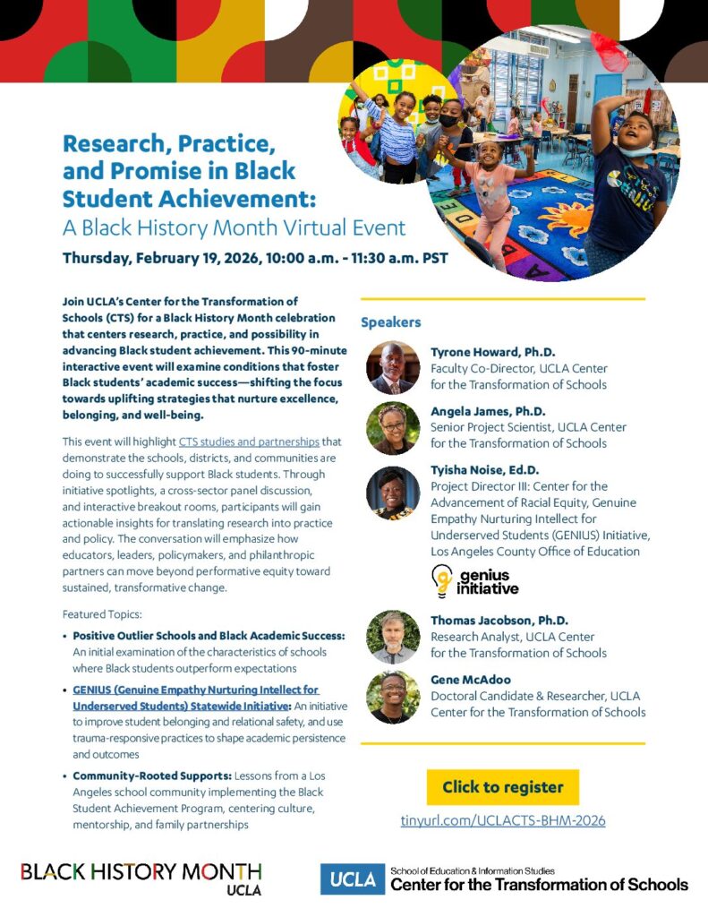 Join UCLA CTS for a Black History Month celebration that centers research, practice, and possibility in advancing Black student achievement. This 90-minute interactive event will examine what conditions foster Black students’ academic success—shifting the focus from deficits to uplifting strategies that nurture excellence, belonging, and well-being.