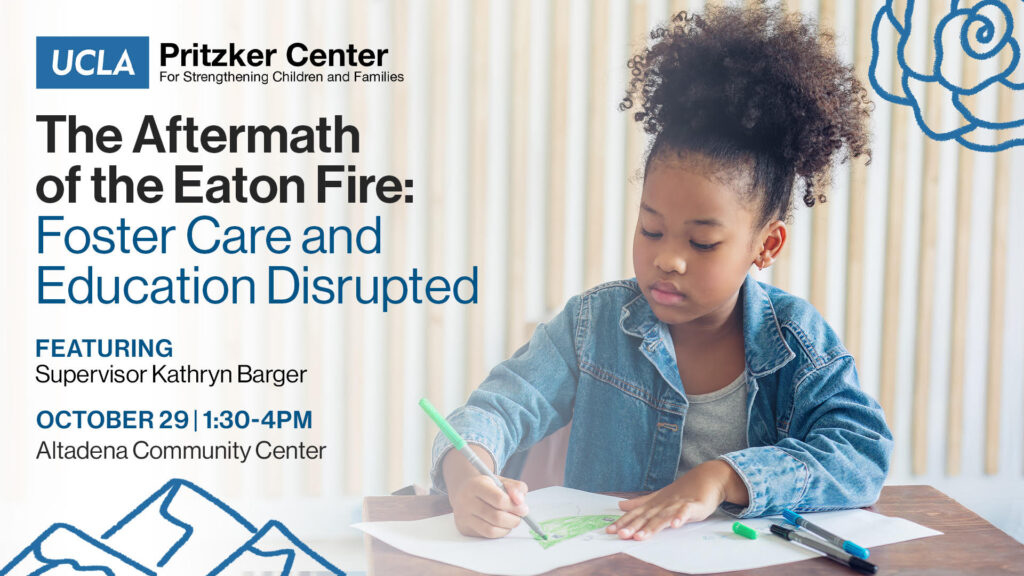 Speakers will include Los Angeles County Supervisor Kathryn Barger, DCFS Director Brandon Nichols and Altadena community members. The research briefing will be led by Laura Liévano-Karim, UCLA Pritzker Center Postdoctoral Fellow. Refreshments from fire-impacted restaurants will be served. Resources from Baby2Baby and the Book Foundation will be offered. We are grateful to the UCLA School of Education and Information Studies, Dean Tina Christie and the Anthony Pritzker Family Foundation for generously supporting this work.