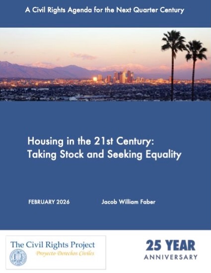 Housing in the 21st Century: Taking Stock and Seeking Equality,” is researched and written by Jacob W. Faber, an associate professor of sociology and public service at NYU’s Wagner School. The paper is published by the UCLA Civil Rights Project/Proyecto Derechos Civiles as part of their research series, A Civil Rights Agenda for the Next Quarter Century.  The research brief is available on the Civil Rights Project website. The Civil Rights Project/Proyecto Derechos Civiles is co-directed by Research Professors Gary Orfield and Patricia Gándara and housed in the UCLA School of Education & Information Studies. CRP’s purpose is to create a new generation of research in social science and law, on the critical issues of civil rights and equal opportunity for racial and ethnic groups in the United States.
