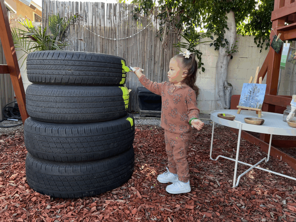 Along with drawing from nature, Reynoso repurposes items that would have been discarded to supply Playful Roots Studio with materials for its play and art making sessions. Her father, who is a mechanic, provided tires of different sizes that she stacked to resemble a Christmas tree that the children could paint. The very young are invited to play with an armature along which wooden beads could be slid, or a basin full of non-toxic paint and water, with orange slices and holly berries afloat resembling a “Winter Soup.” Older children could design snowflakes with wooden popsicle sticks or sculpt with air-drying clay.