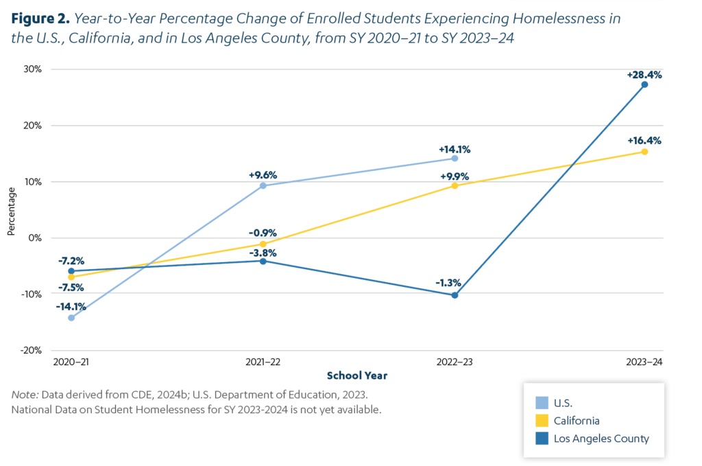Between school years 2022–23 and 2023–24, student homelessness rose 30 percent in Los Angeles County, according to a new analysis by the UCLA Center for the Transformation of Schools. An estimated 61,249 students experienced homelessness in the county during the 2023–24 school year. The rate of student homelessness in the county significantly exceeds the percentage of student homelessness in California which saw a 16 percent increase between 2022–23 and 2023–24, according to the California Department of Education.
