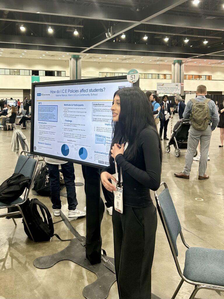 A junior at Mann UCLA, Munguia presented her study, “How do ICE Policies Affect Students.” A mixed methods study including interviews with community organizers and a survey of 202 students from a high school in south Los Angeles, her research plumbed the impact of recent ICE activities in Los Angeles. Among her findings, students feel anxious and scared when they hear about ICE activities and the constant worry can make it hard for students to focus in class, leading to poor academic performance and increased stress levels.